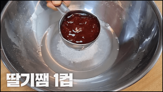 3) 소금이 어느 정도 녹았으면 딸기잼 1컵을 넣어줍니다.