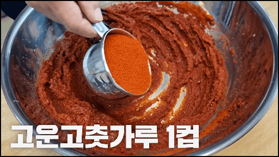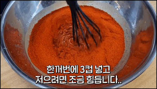 6) 어느 정도 잘 섞였다면 남은 고춧가루 1컵을 넣고 잘 섞어줍니다.