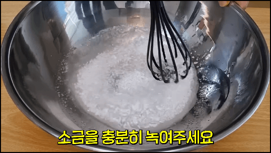 2) 천일염 2/3컵, 약 135g을 넣어서 녹여줍니다. 시간이 조금 걸리더라도 소금을 천천히 녹여줍니다.