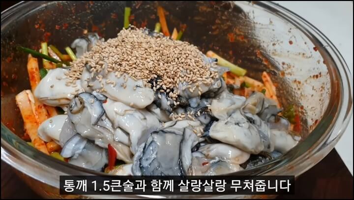 씻어 놓은 굴 400g을 넣고 통깨 1.5큰술을 넣은 후 가볍게 살살 무쳐줍니다.
