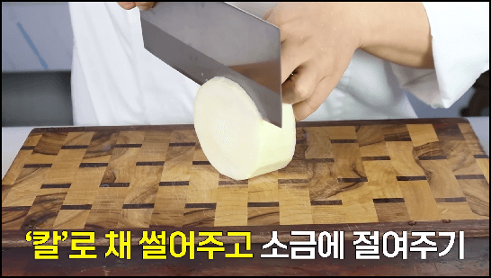 굴을 숙성시키는 동안 부재료를 썰어줍니다. 굴과 궁합이 좋은 무를 준비해서 채 썰어줍니다. 무는 한토막 정도만 준비하면 되고, 채칼로 썰면 무에 물이 많이 생기기 때문에 채칼 대신 일반 칼로 채 썰어주는 것이 좋습니다.