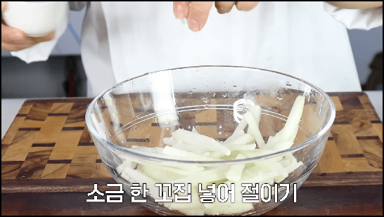 그리고 채 썬 무에 소금을 조금 넣고 절여줍니다. 이렇게 절여주면 시간이 지나도 물이 생기지 않고 꼬들꼬들 무의 식감도 더 좋아집니다.