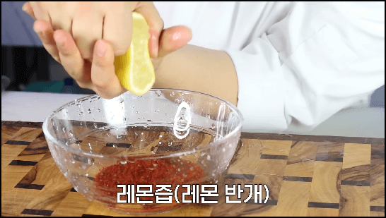 굴무침 황금레시피로 양념을 만들어 봅시다. 고춧가루 5큰술, 매실액 2큰술, 레몬 반개 즙을 짜서 넣어줍니다. 식초 대신 레몬즙을 넣게 되면 더욱 고급스러운 맛이 납니다. 여기에 멸치액젓 2큰술, 다진마늘 1큰술, 설탕 1큰술을 넣고 골고루 잘 섞어줍니다.