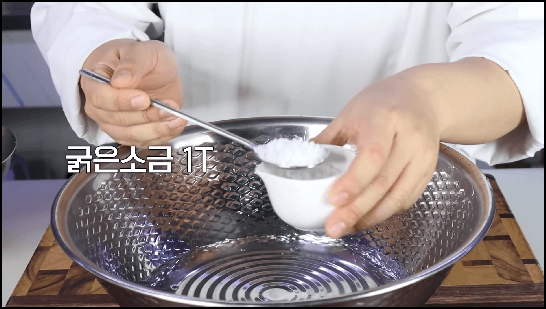 구입한 굴을 씻어주는데 소금에 바로 문질러서 씻으면 굴에 상처가 나고, 상처가 나면 비린내가 날 수 있습니다. 그러니 굴은 소금물에 살살 씻어주어야 합니다.