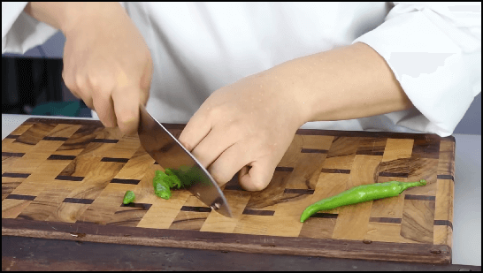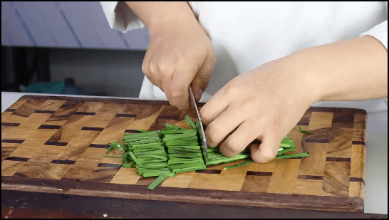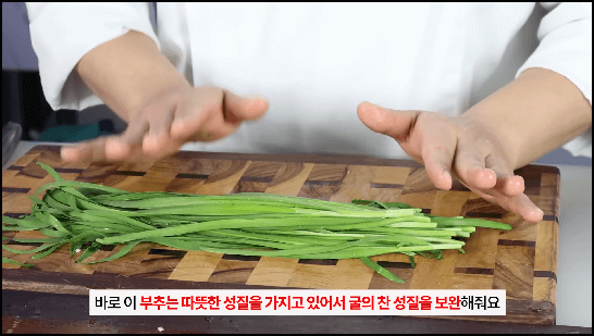 청양고추 2개는 어슷썰어 줍니다. 부추는 5cm 길이로 썰어주는데, 부추는 따뜻한 성질을 갖고 있어서 굴의 찬 성질을 보완해 줄 수 있습니다. 굴무침에 쪽파를 많이 넣지만 부추를 넣어도 서로 잘 어울립니다.