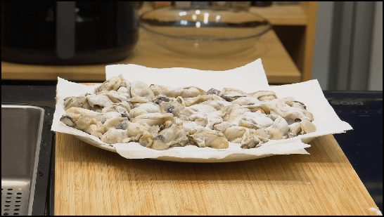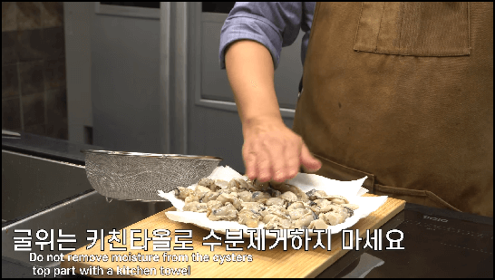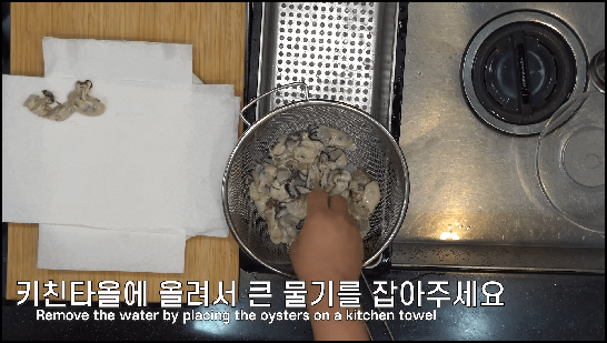 체에 밭쳐서 물기를 뺀 다음 키친타올을 깔고 그 위에 굴을 하나씩 올려줍니다. 굴 위쪽은 키친타올로 닦지 않고 그대로 둡니다. 잠시 물기가 빠지도록 그대로 둡니다.