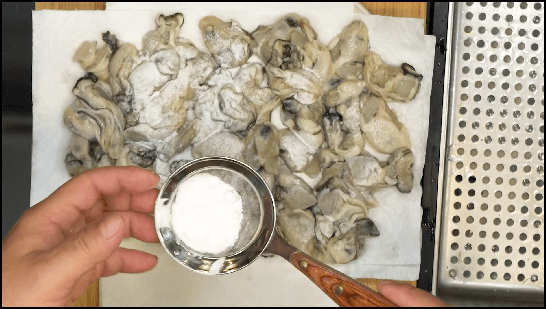 굴 위에 전분가루를 뿌려줍니다. 굴 위에 살살 뿌려주면 되고, 밀가루 대신 전분을 뿌려서 사용하면 굴이 부드러워지고, 그러면서 상당히 탱글탱글한 맛이 있습니다.