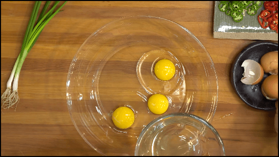계란 2개는 전부 다 깨서 넣고, 계란 1개는 노른자만 사용합니다. 색을 더 노랗게 해 주기 위해서입니다. 소금 2~3꼬집 넣고, 후추 약간 넣어서 계란을 풀어줍니다.