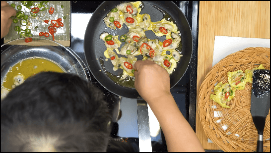 이제 굴전을 구워주면 되는데요, 불은 약불로 하고 올리브오일 살짝 두른 후 굴을 올려줍니다. 하나씩 올려도 되지만 손이 많이 가니 여러개 쫙 깔아주면 됩니다. 그리고 고명으로 썰어 둔 고추를 하나씩 올려서 박아줍니다. 청고추 홍고추 각각 올려주고, 쪽파 썬 것도 같이 올려줍니다. 고명을 다 올렸다면 계란물을 조금씩 부어서 고명이 떨어지지 않도록 해 줍니다.