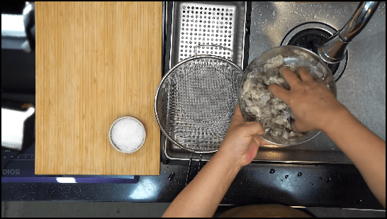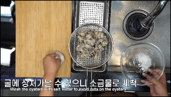 굴은 소금에 바로 씻으면 상처가 나기 때문에 소금물에 씻는 것이 좋습니다. 물에 소금을 넣고 녹인 후 소금물에 굴을 넣고 조물조물 씻어줍니다. 두번 정도 소금물에 씻어주고 찬물에 서너번 헹궈주면 됩니다.