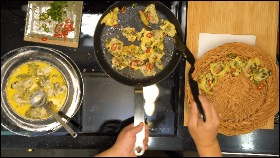 굴의 물컹함은 전분이 잡아주었는데요, 전분이 계란 속으로 들어가면서 더욱 부드러움과 탱글함을 줍니다. 청고추와 홍고추, 쪽파는 굴과 계란의 비린 맛을 잡아주고, 굴 자체의 짭잘한 맛도 있어서 아주 맛있는 굴전이 만들어졌습니다. 재료들이 기가 막히게 조화로워서 그 어떤 굴전보다 맛있게 드실 수 있습니다.