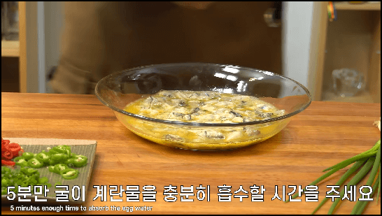 계란에 굴을 모두 집어 넣고 그대로 5분 정도 두어서 계란물이 흡수되도록 합니다.