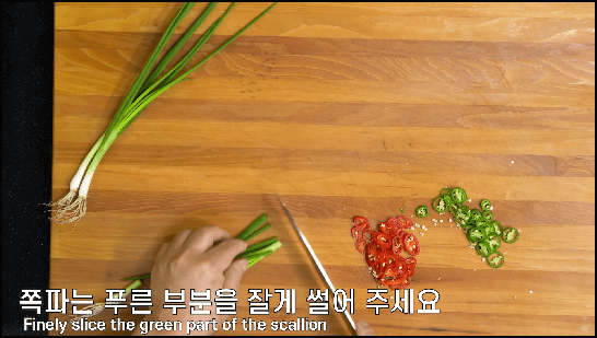 굴전 맛있게 만드는법에 빠질 수 없는 재료가 청, 홍고추입니다. 맵지 않은 것으로 하나씩 준비하면 되고, 가늘게 송송 썰어줍니다. 쪽파 한 줄기도 초록 부분만 가늘게 송송 썰어줍니다.
