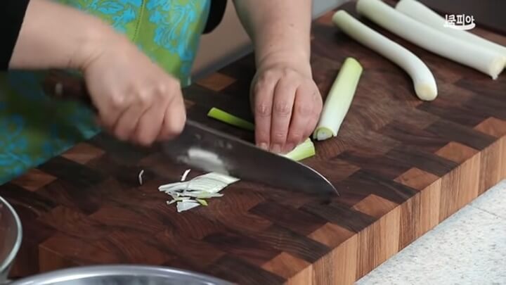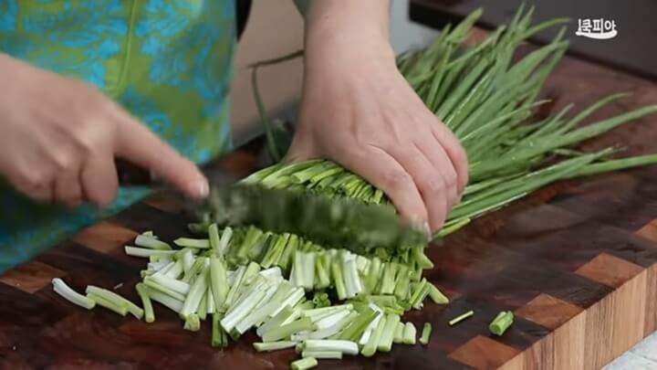 쪽파도 1~2cm 길이로 잘라줍니다. 김장철에 나오는 쪽파는 뿌리 쪽이 그리 두껍지 않기 때문에 그냥 사용하면 됩니다.