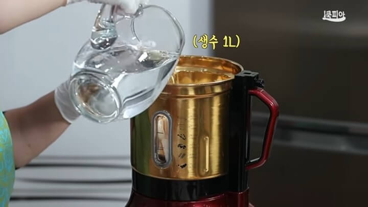 믹서기에 준비한 재료를 모두 넣고 생수 1리터를 넣어서 곱게 갈아줍니다. 곱게 간 것은 베 보자기에 넣고 잘 봉해서 잡은 다음 문질러가며 치대서 즙을 내줍니다. 손으로 꼭 짜서 마지막 즙까지 잘 짜내 줍니다. 이렇게 즙을 내지 않고 배 껍질을 벗겨서 간 다음 건더기까지 모두 사용해도 괜찮습니다.