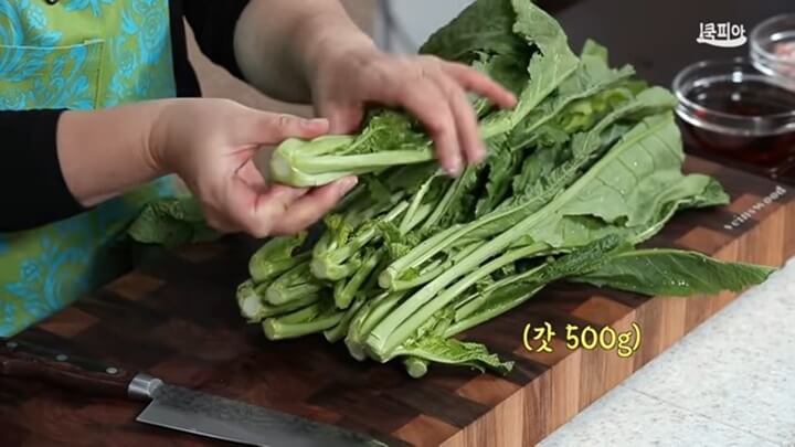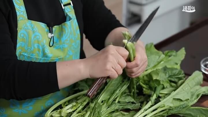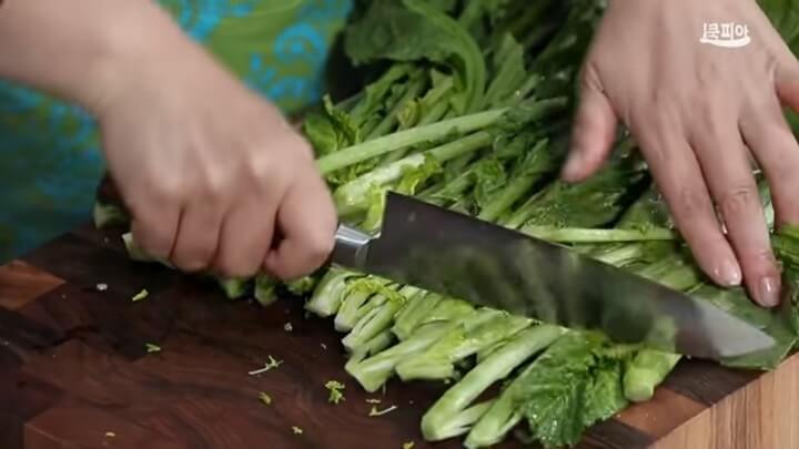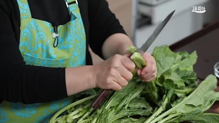 칼등으로 두드린 후에 먹기 좋은 크기로 적당하게 썰어줍니다. 김장김치 맛있게 담는법에서 빠질 수 없는 재료가 갓인데요, 갓이 들어가야 방부효과도 있고 알싸한 맛이 나서 더욱 맛있습니다.