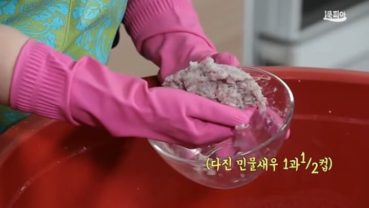다진 마늘 1컵, 다진 생강 2큰술을 넣고, 한 가지 또 특별히 들어가는 재료가 있는데요, 그건 바로 민물새우입니다. 새우를 다져서 1과 1/2컵을 넣어줍니다. 새우를 넣어주면 단맛도 나면서 감칠맛이 돌아 김장김치가 훨씬 더 시원하고 맛있어집니다.