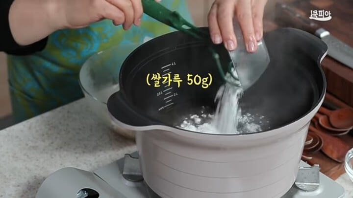 30분간 끓여서 육수를 낸 다음 다시팩은 건져내고, 불을 끈 상태에서 쌀가루 50g을 넣어서 잘 풀어줍니다. 그런 다음 불을 켜서 풀죽을 끓여줍니다.