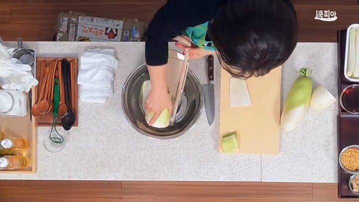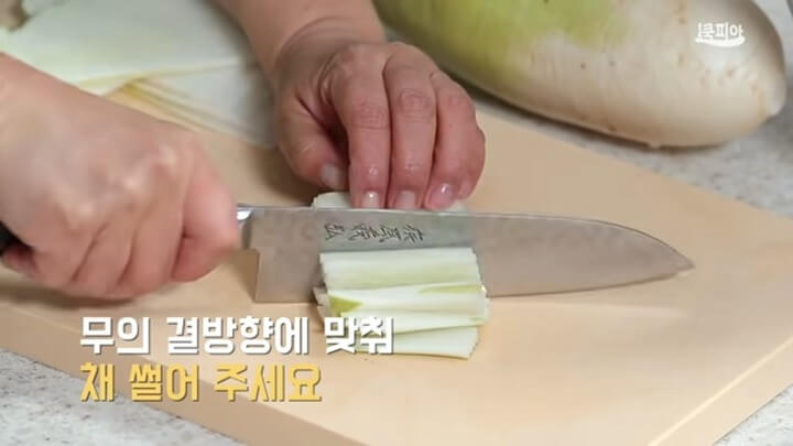 그러니 무 길이방향으로 슬라이스를 한 다음 여러 장 겹쳐서 채를 썰어주는데, 그대로 채 썰면 길이가 너무 길기 때문에 반으로 자른 다음 길이방향으로 채 썰어줍니다. 그러면 무채가 부서지지 않고 잘 유지됩니다.