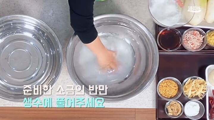 한 가지 팁을 주시는데, 만약 배추가 약간 덜 절여져서 가운데 부분이 딱딱한 느낌이라면 웃소금을 한 번씩만 콕콕