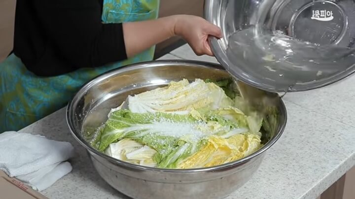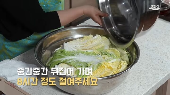 배추는 중간중간 뒤집어 가며 8시간 정도 절여줍니다. 보통 전날 저녁에 절이고 중간에 뒤집어 준 다음, 다음날 아침에 헹궈서 물기를 빼면 됩니다.