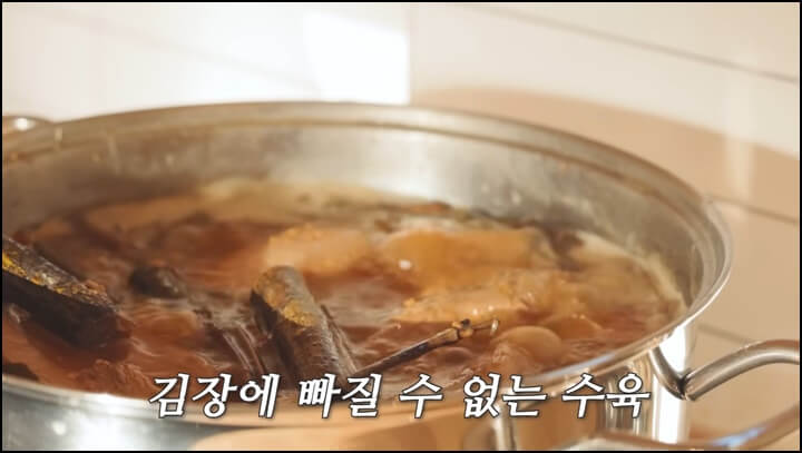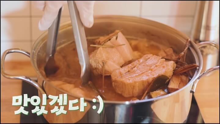 약재까지 넣고 삶아서 그런지 수육이 정말 맛있어보이네요! 갓 만든 김장김치와 함께 먹으면 정말 맛있겠습니다.