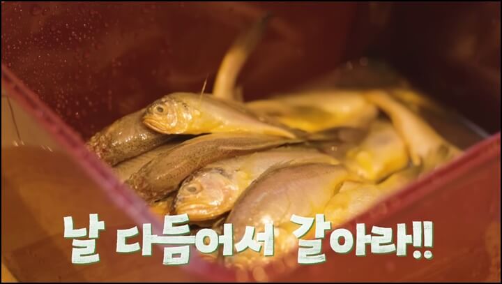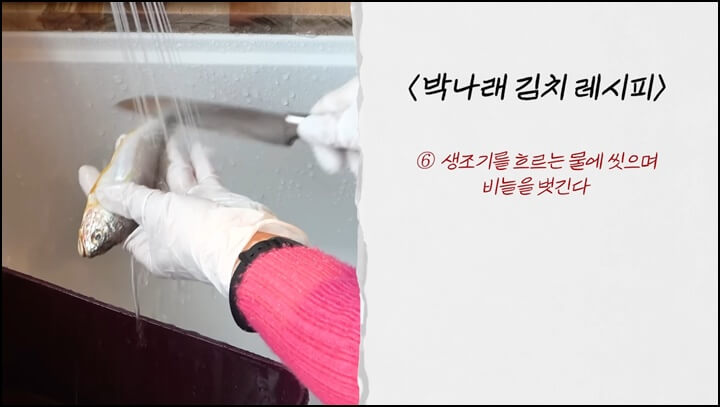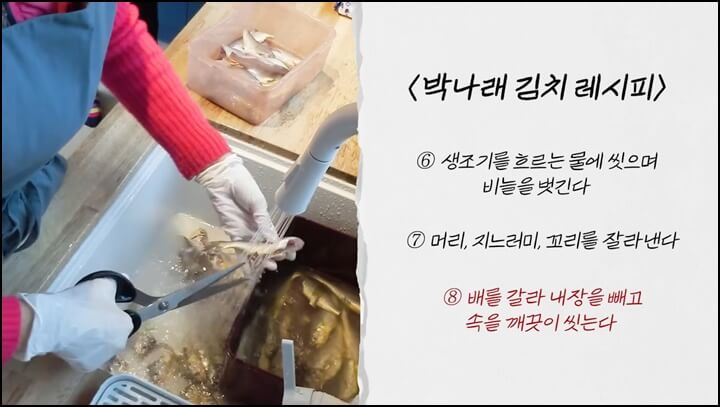 박나래 김장김치 맛있게 담는법에는 생조기가 들어가는데요, 생조기를 흐르는 물에 씻어가며 비늘을 벗겨줍니다. 그런 다음 가위로 머리, 지느러미, 꼬리를 잘라내고, 배를 갈라 내장을 빼내서 속을 깨끗이 씻어줍니다.