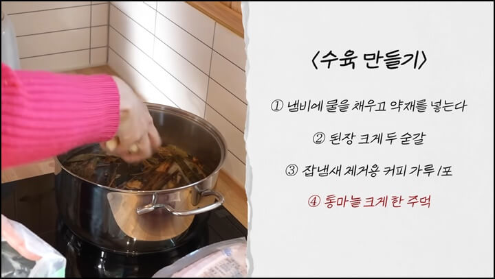 김장에 수육이 빠질 수 없죠. 막간을 이용해 수육 만들기를 합니다. 냄비에 물을 채우고 약재를 넣어줍니다. 약재가 없다면 허브 종류도 괜찮을 듯 합니다.