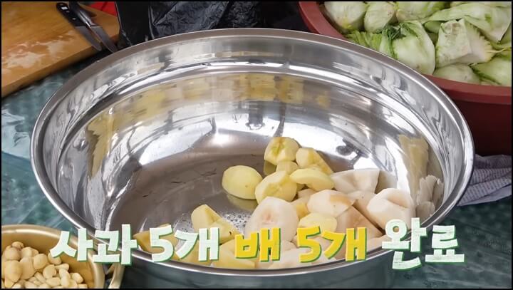 배 5개, 사과 5개를 껍질을 깍은 후 씨를 빼내고 적당한 크기로 썰어줍니다. 무 4개도 갈아줄거라서 대충 깍뚝썰기 합니다. 채를 썰 필요가 없다네요ㅎ