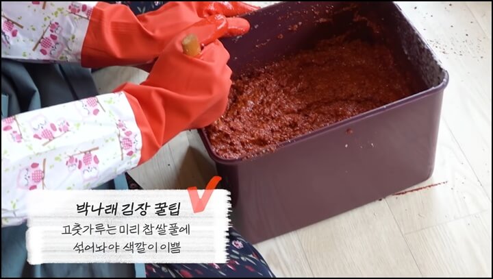 곱게 간 찹쌀풀에 고춧가루 2.5kg을 넣고 잘 섞어줍니다. 이렇게 미리 고춧가루를 찹쌀풀에 섞어서 불려놓으면 색깔이 이쁘게 나옵니다. 하루전날 미리 불려놓기도 합니다. 김장김치 맛있게 담는법 꿀팁이니 기억해두고 활용하시면 좋을 듯 합니다.