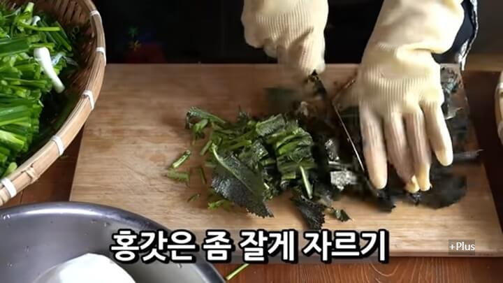 김장김치 맛있게 담는법에 들어갈 부재료를 손질합니다. 홍갓은 필수로 넣는 것이 좋은데 청갓보다 홍갓이 더 향이 진합니다. 청각은 안 넣어도 되지만 들어가면 김치 맛을 시원하게 해 줍니다.