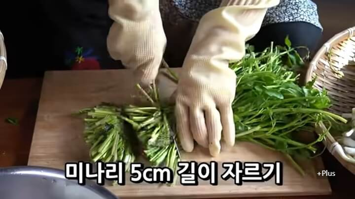 청각의 끝 부분(뿌리 쪽)은 돌이 붙어 있을 수 있으니 잘라냅니다. 그런 다음 가지런히 모아서 적당한 길이로 썰어줍니다. 청각은 너무 쫑쫑 썰면 나중에 김치에 벌레가 붙은 것 같은 비주얼이라 너무 잘게 썰지 않도록 합니다.