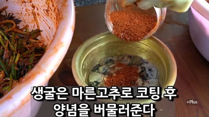 생굴은 고춧가루를 조금 뿌려서 코팅한 후에 양념을 넣어서 버무려 줍니다. 생굴은 미끈거리기 때문에 마른 고춧가루로 옷을 입힌 후에 양념을 버무려야 양념이 잘 묻습니다.