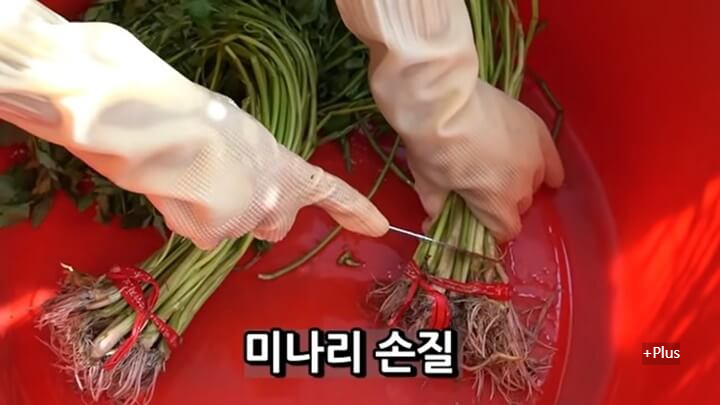미나리는 단을 풀지 않은 채 한 손에 잡고 뿌리 쪽을 넉넉하게 잘라줍니다. 줄기를 조금 남겨서 자르는 이유는 그대로 화분에 심어두면 다시 싹이 올라오기 때문에 버리지 말고 재활용해서 기르면 됩니다.