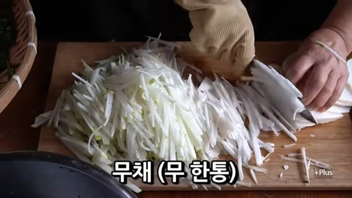 홍갓은 좀 잘게 잘라줍니다. 무 1개는 채 썰어 준비합니다.