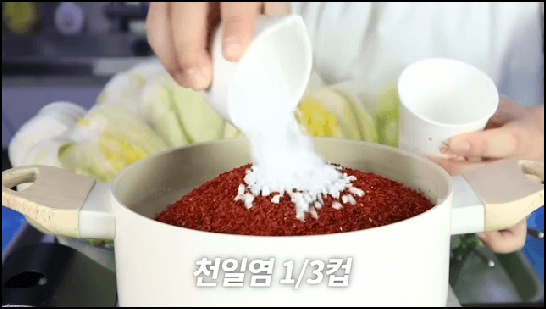 고춧가루 4컵, 설탕 1/2컵, 천일염 1/3컵