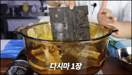 이대로 불을 켜서 센불에서 끓여주다가, 물이 끓는 시점부터 약 15분간 더 끓여서 육수를 우려냅니다. 다만 5분이 지나면 다시마는 건져내 줍니다. 다시마를 5분 이상 끓이게 되면 점액질이 나와 육수가 탁해지니 맑고 깔끔한 육수를 위해서는 다시마를 건져주는 것이 좋습니다.