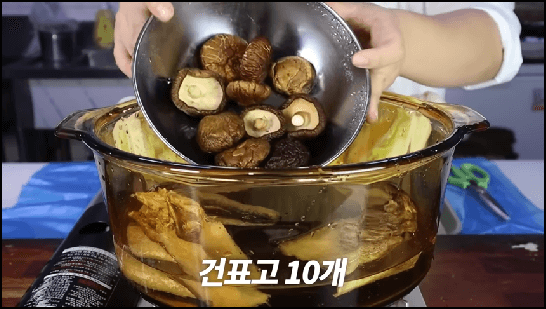 절임배추를 준비하셨다면, 가장 먼저 육수 만들기를 해야 합니다. 맛있는 김장김치를 위해서 깊고 구수한 육수를 만들어야 하는데요, 먼저 냄비에 1.5리터 물을 넣고, 통 북어 1마리를 4등분으로 잘라 넣어줍니다. 다시마 20g 1장을 넣고, 건표고버섯 10개도 넣어줍니다.