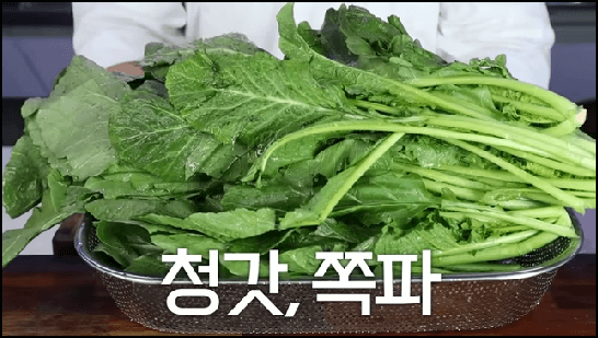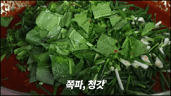 여기에 쪽파와 청갓 자른 것을 넣어서 버무려 줍니다. 그러면 김장김치 양념만들기는 끝입니다. 이제 배추에 양념을 버무리기만 하면 됩니다.