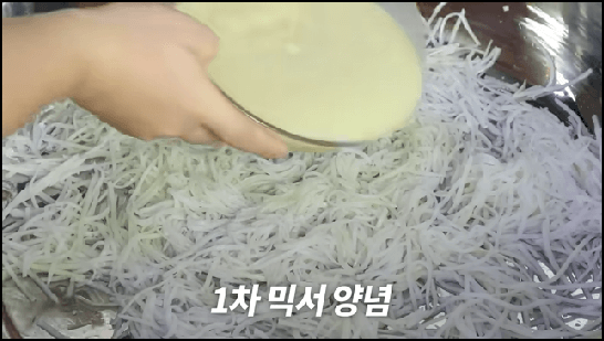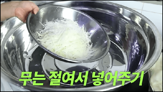 무채는 바로 넣는 것이 아니라 비룡님만의 비법이 있는데요, 바로 무채를 절여서 넣는 것입니다. 무채를 살짝 절이게 되면 무가 더 탄탄해지고, 식감도 더 좋아집니다. 그리고 절여서 나오는 물도 버리지 않고 그대로 같이 사용합니다.