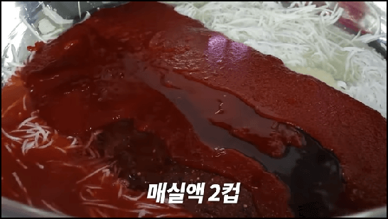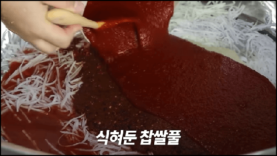 찹쌀풀 식은 것, 매실액 2컵, 멸치액젓 1.5컵, 매운 고춧가루 2컵
