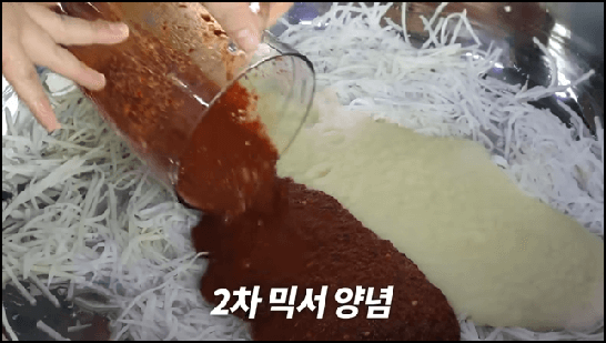 무채가 잘 절여졌다면, 1치로 갈았던 믹서기 양념을 넣어주고, 2차로 갈았던 믹서 양념도 같이 넣어줍니다.