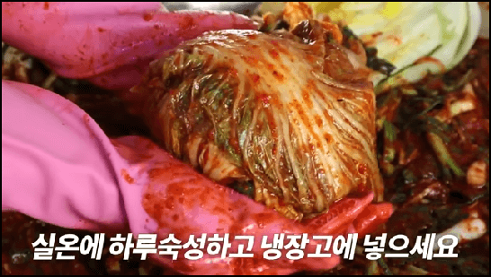 그렇게 하나씩 배추에 양념을 바르고 겉잎으로 감싸서 김치통에 하나씩 담아주면 됩니다. 완성된 김장김치는 실온에서 하루 숙성한 후 냉장고에 넣으면 됩니다.