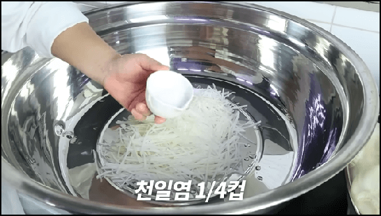 무채를 대야에 넣고 천일염 1/4컵을 골고루 뿌려줍니다. 이대로 5분간 절여줍니다.