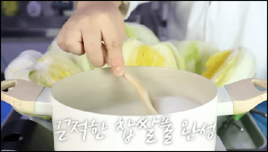 그런 다음 불을 켜서 찹쌀풀을 쑤어주는데, 바닥에 눌러붙을 수 있으니 계속 저어가며 끓여줍니다. 끓는 점부터 1분간 끓여주고 불을 끄면 됩니다.