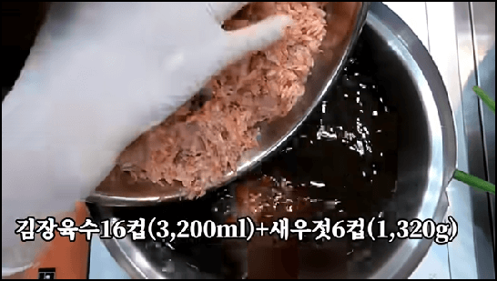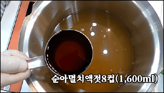 배추의 물을 빼는 동안 김장육수 및 찹쌀풀을 만들어서 충분히 식혀 주어야 합니다. 김장육수 16컵(3200ml)에 새우젓 6컵(1320g)을 넣고, 감칠맛은 높고염도가 낮은 순아 멸치액젓 8컵(1600ml)를 넣어서 부르르 끓여서 식혀줍니다. 김장육수에 젓갈이나 액젓을 넣고 끓이면 비린맛을 없애고, 액젓 특유의 향도 제거하여 구수한 향이 나게 해 줍니다. 액젓 향을 싫어하시는 분들은 이렇게 끓여서 사용하면 좋습니다.