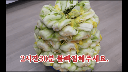 부재료를 모두 다 준비해 둔 다음 절임배추 물을 빼 주면 됩니다. 소쿠리에 차곡차곡 담아서 물을 빼 주는데 절임배추는 물이 거의 빠진 상태로 오기 때문에 긴 시간 물기를 뺄 필요없고, 2시간 ~ 2시간 30분 정도 물을 빼 주면 됩니다.
