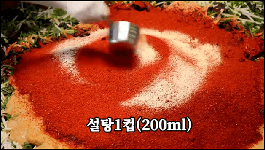 고춧가루 4kg을 모두 넣고 설탕 1컵을 넣어서 골고루 잘 버무려 줍니다. 골고루 잘 버무린 후 맛을 보고 최종간을 맞춰줍니다. 천일염 3컵을 넣어서 간을 맞춰주고, 고춧가루가 붇도록 30분 정도 그대로 둡니다.