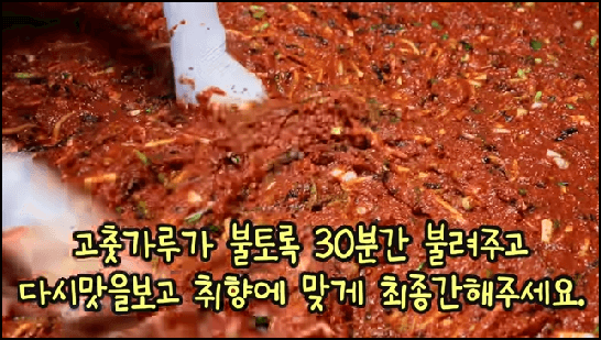 30분 후에 맛을 한번 더 보아서 절임배추의 염도와 개인의 입맛에 맞게끔 짠맛과 단맛을 맞춰주면 됩니다.
