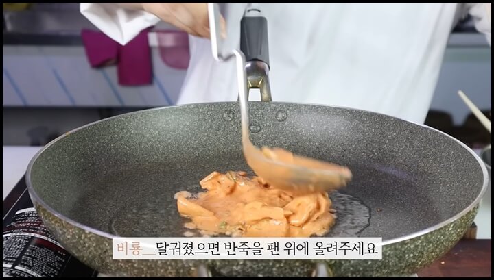 팬에 기름을 충분히 둘러줍니다. 팬과 기름이 달궈진 다음에 반죽을 올려야 합니다. 달궈지기 전에 반죽 올리는 것은 절대 금지!입니다.